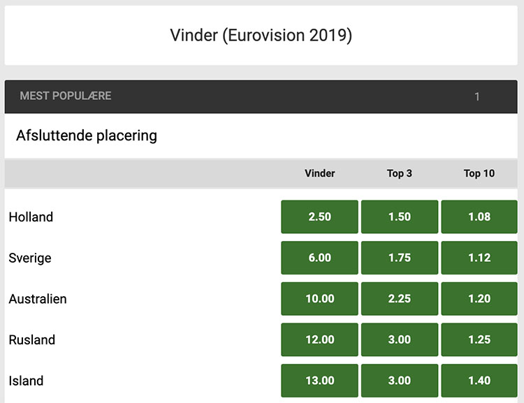 Bookmakers vælger favoritter til at vinde Eurovision Sangkonkurrence i 2019 blandt mange forskellige lande, der er med i Konkurrencen. Bookmakerne beregner deres odds ud fra en chancevurdering af enhver deltager. Danmark er selvfølgelig også med i Eurovision 2019 med Leonoras “Love Is Forever”, men bookmakerne har desværre ikke de store forventninger til denne sangerinde. Derimod Holland og Sverige er blandt favoritterne. Du kan finde info om Eurovision odds på forskellige betting sites og online casinoer.